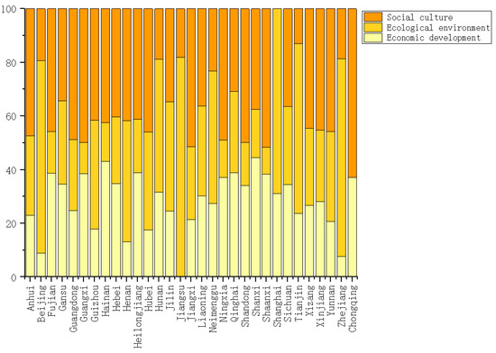 Figure 4 demonstrates the CSDI scores and obstacle degree of each system in thirty-one provinces in China in 2021, revealing that the distribution of shortcomings in the three systems of economic development, social culture, and ecological environment in each province presents significant regional heterogeneity, and there is an obvious difference in the intensity of constraints between systems. In the economic field, resource-dependent provinces, such as Shanxi, and areas with a single industrial structure, such as Hainan and the northeast, have a high degree of economic obstacles, revealing problems such as irrational industrial structure and a lack of transformation momentum. On the contrary, developed eastern provinces such as Jiangsu, Zhejiang, and Beijing have a low degree of obstacles to economic development and a high degree of obstacles in the social sphere; despite their strong economic strength, the imbalance between population agglomeration and the distribution of social resources is prominent. In the environmental field, industrially developed provinces such as Shandong and resource development-dependent regions such as Jiangxi have significantly high barriers, with prominent conflicts between development and environment and a mismatch between environmental governance capacity and industrial development needs. The differentiation of barrier types and intensity between regions maps out the multi-level imbalance of China’s county development.