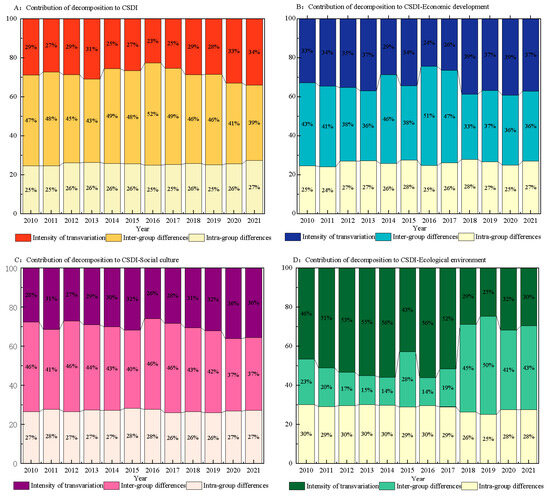 China’s CSDI is the highest for ecology and environment among the three systems, with a score rising from 68.54 in 2010 to 75.67 in 2021 and with a slight drop to 67.18 in 2015, showing a sharp upward trend starting from 2016, with an average annual growth rate of about 2%. In 2015, China began to strengthen the implementation of environmental policies, which, in the short term, affected the economic-environmental balance. However, from 2016 onwards, the effects of environmental governance became apparent, and the environmental quality of counties improved, driving a significant increase in the score in the environmental domain. These changes are most evident in the western and central regions, reflecting China’s emphasis on environmental governance in inland areas. In the CSDI socio-cultural area, the national score rose from 57.63 in 2010 to 69.88 in 2021, with the eastern and central regions consistently scoring higher than the national average and the western and northeastern regions lagging behind despite improvements, highlighting the disparities between regions regarding social investment and cultural facilities. The northeastern part of the region shows a relatively large fluctuation from 2017 to 2020, which is consistent with changes in the region’s economic sector, and there is a certain lag in changes in the social sector, reflecting the decisive influence of economic construction on social development.