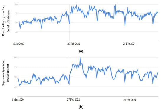 The dynamics of interest in the terms “digitalization” and “sustainable development”. (a) The dynamics of interest in the term “digitalization” over the last 5 years [41]. (b) The dynamics of interest in the term “sustainable development” over the last 5 years [1].