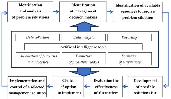 By analyzing the practical cases and opinions of researchers, it is possible to aggregate the functions of artificial intelligence in the process of the development and implementation of managerial decisions, which Figure 2 reflects.