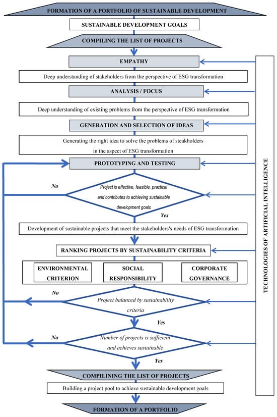 The present paper is organized as follows. The introduction substantiates the research interest in the issues of sustainable development in the context of artificial intelligence technologies’ integration into design-thinking processes in enterprise managerial decision-making. Section 2 contains a theoretical analysis of the provisions of sustainable development digitalization, exploring the role of digital technologies in the ESG Agenda and the study of digital tools used for sustainable development by modern enterprises. Section 3 describes the research methodology. Section 4 presents the analysis possibility of artificial intelligence technologies used in design-thinking and managerial decision-making for ESG transformation. Section 5 introduces the model for developing a strategy for the integration of artificial intelligence technologies into the process of managerial decision-making and an algorithm for selecting sustainable development projects. Section 6 provides a discussion and conclusions of the research.