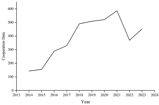 The evolutionary trend of the Pearl River–Xijiang Economic Belt cooperation data from 2014 to 2023.