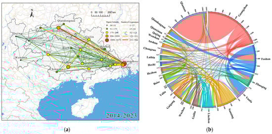 The spatial pattern of the intercity cooperation network in the Pearl River–Xijiang River Economic Belt, 2014–2023. (a) Geographical network; (b) topological network.