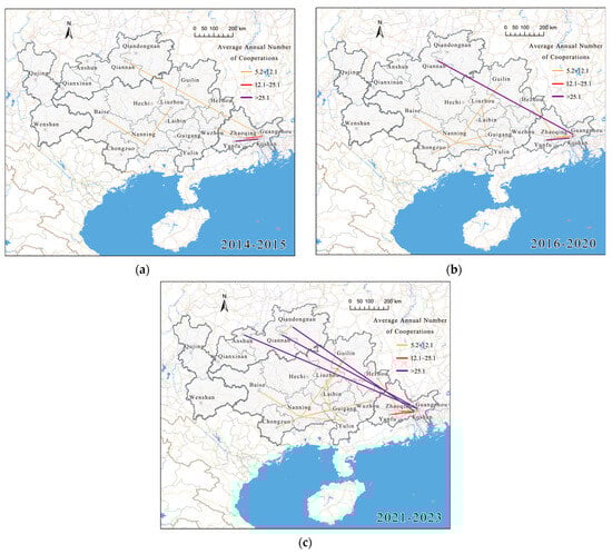 The evolution of the intercity cooperation network in the Pearl River–Xijiang Economic Belt, 2014–2023. (a) 2014–2015; (b) 2016–2020; (c) 2021–2023.
