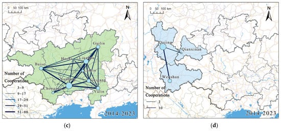Subgroups of the intercity cooperation network in the Pearl River–Xijiang Economic Belt. (a) Subgroup 1; (b) Subgroup 2; (c) Subgroup 3; (d) Subgroup 4.