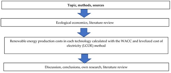 Figure 1 presents the topic, methods, and sources of analysis presented in the paper. Using the literature review method, we present the ecological economics rules. Using the WACC, we present the renewable energy production, and using the LCOE, we describe the cost of electricity. Finally, using our own research results and literature sources, we present the discussion and conclusions of the paper.