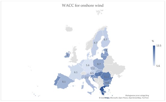 The WACC for onshore wind is diversified in the European Union (EU) (Figure 3). The WACC for onshore wind was calculated by Vartiainen et al. [75]. The authors found that the lowest WACC for onshore wind was achieved by Germany (5.6%), France (6.1%), Sweden, and Finland (6.7%). The highest WACC was achieved by Greece (13.5%), Hungary (11.3%), and Portugal (10.2%).