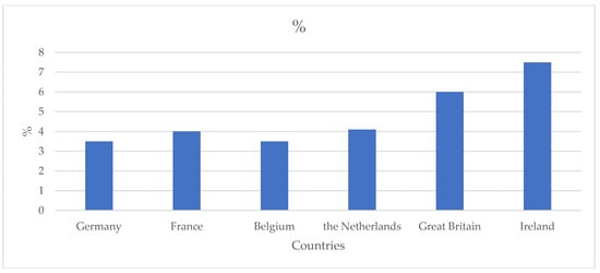 Offshore wind is characterized by different WACC levels in Germany (3.5–9%), France (4–4.3%), Belgium (3.5–4%), the Netherlands (4.1–5.9%), Great Britain (6.0%), and Ireland (7.5–8%) (Figure 4). The differences in offshore wind are the result of the different risk profiles of each country with this source of renewable energy [80].