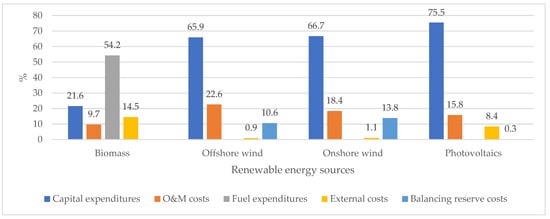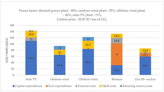 Structure of electricity generation costs. Source: own elaboration based on the “Update to a comparative analysis of electricity generation costs in nuclear, coal-fired, and gas-fired plants, and renewable power plants” [72].