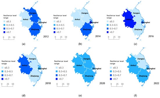Figure 3a shows the geographical distribution for the year 2012. Zhejiang has the greatest level of rural resilience, followed by Jiangsu, while Anhui and Shanghai perform substantially better. This finding suggests that Zhejiang and Jiangsu began rural infrastructure development and ecological and environmental protection earlier, with significant consequences. Anhui and Shanghai may see reduced rural resilience as a result of economic structural instability or delayed policy execution.