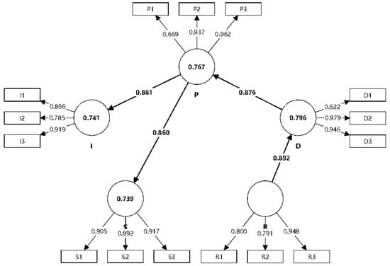 This study used the Smart PLS 4.0 software to determine the R2 value, hence assessing the model’s explanatory power. The R2 values of 0.796, 0.741, 0.767, and 0.739 indicate that the model has significant explanatory power. The driving variables, influencing variables, pressure variables, and state variables have R2 values of 0.791, 0.735, 0.761, and 0.733, indicating that they have significant explanatory power for the model.
