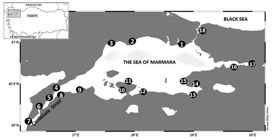The SoM comprises a volume of 3378 km3 and an area of 11,500 km2. The waters originating from the Black Sea and the Aegean Sea constitute two separate layers in the straits and the SoM. The most important oceanographic feature of the SoM is that it has a continuous double-layer water regime in which the less salty (18 PSU—Practical Salinity Units) Black Sea water constitutes the upper layer and salty (38.5 PSU) Mediterranean water constitutes the lower layer, and they flow through the straits in opposite directions relative to each other [35,36,37]. In terms of pollution, it is known that the coastal regions of the SoM are home to Türkiye’s most densely populated and industrialized areas [38].