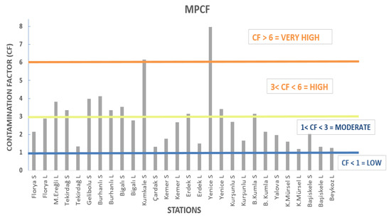 MPCf (microplastics contamination factor) the contamination of represents MPs in the analyzed research material (MPi) relative to the background (baseline) level (MPb) [53]. The optimal baseline value would be the MP level measured in a sample prior to the rapid expansion of the plastics industry. However, since there was no plastic study conducted before the industrialization of the SoM, the lowest MPs value recorded in the study (0.84 items/gr) was taken as the MPb for this study. This value was considered as the value determined in the samples taken from Station 11, which is located at the top point of the Kapıdağ peninsula, which showed the lowest amount of MP, where there is little settlement and no industrialization. Furthermore, the MPLI was calculated as the nth root of the product of each MPCf [53].