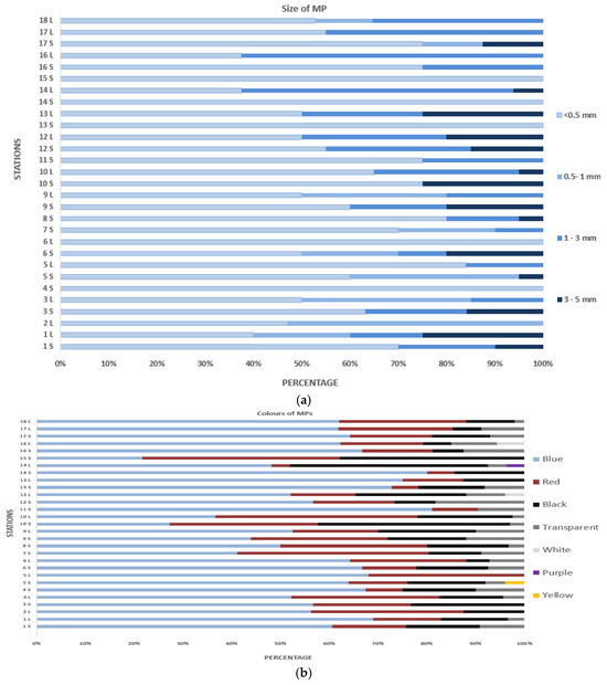 Microplastics were classified into seven color groups: blue (57.87%), red (20.27%), black (16.30%), transparent (7.48%), white (4.85%), purple (3.7%) and yellow (4%, found at one station). Blue was the most common color, consistent with a study in Bandırma Bay [30]. While Gedik et al. [22] did not specify colors in their study on SoM mussels, Tunçelli and Erkan [31] identified 16 colors, with black predominating. Other studies [33,78,79] also reported various colors, including blue, red, black, purple, transparent and yellow. The color of microplastics can indicate their degradation level and photodegradation in aquatic environments [80].