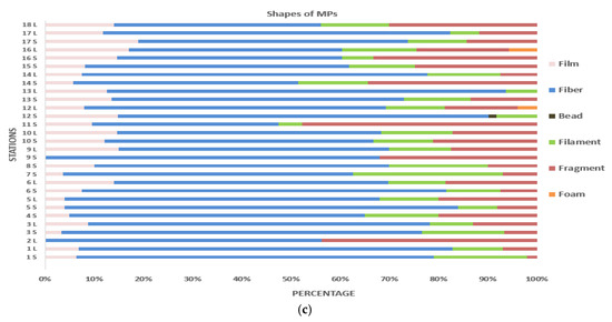 The stations with the highest presence of fibers were Yenice (St 12) 75.4%, Kurşunlu (St 13) 81.25% and Bigalı (St 6). Kurşunlu station is located in Gemlik Bay, and high MP contamination has been reported in fish and sediment samples from this bay [92]. It is worth stating that Gemlik Bay is a center of industry and trade, with the presence of commercial ports [92], and major ports such as Gemport, Borusan and Roda are located in the south of the bay [93]. Moreover, it was reported that the sediments of this region were exposed to significant MP pollution due to the effect of the Karsak Stream flowing into Gemlik Bay [94]. The other two stations with high fiber contents (St 6 and 12) have the fact that they are located close to rivers in common. In particular, Yenice station is close to the Simav River, while Bigalı station is close to the Kayaaltı Stream that flows into the Çanakkale Strait. The fact that all three stations mentioned in this study have high fiber-type MP ratios indicates that fiber-type MPs, which are predominant in rivers, are directly transported to the sea, and that the seas are also seriously contaminated and exposed to MPs through rivers.