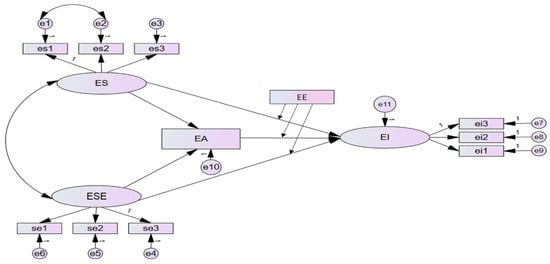 As discussed above, since there is a positive relationship between ES and EA and between EA and EI, it can be inferred that EA plays a mediating role between ES and EI. However, since the mediating effect is affected by the size and standard error of the correlation between the two variables, it needs to be empirically confirmed. It has not yet been empirically confirmed that EA plays a mediating role between ES and EI. Since there is a positive relationship between ESE and EA, as well as between EA and EI, it can be inferred that EA will play a mediating role between ESE and EI. When EE increases EI, EA plays a positive mediating role [25]; it also plays a mediating role between ESE and EI [25,31].