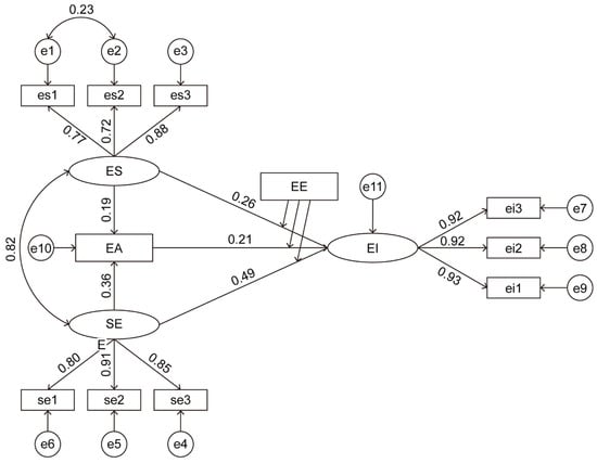 The factor load of the three measurement variables of the latent variable ES scale is 72 to 88, the factor load of the three measurement variables of the ESE scale is 80 to 91, and the factor load of the three measurement variables of the EI scale is 0.92 to 93, which is statistically significant (p < 0.001).