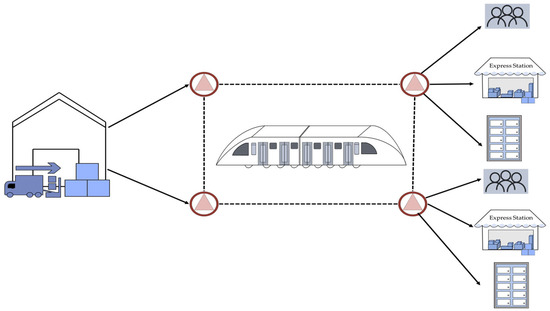 The metro logistics system (M-ULS) uses the available transportation capacity of the metro system during off-peak passenger periods to deliver freight. This strategy not only ensures the safety and punctuality of logistics operations but also aims to enhance the quality of logistics services and increase customer satisfaction [5]. The system is composed of a distribution center, metro stations (i.e., distribution sites), the metro network, and end customers, as depicted in Figure 1. In the first part of the metro logistics system, from the distribution center to the distribution site, distribution can be executed via the metro system or traditional freight trucks. A crisscrossing metro network and most hub stations form the backbone of the system. Workers temporarily store goods at distribution sites near metro stations. In the final phase, specifically from the distribution center to the end consumers, couriers use above-ground transportation tools to collect and send the products to the customers.
