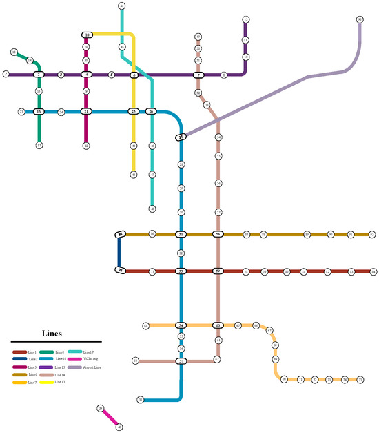 The official websites of Beijing Metro and Beijing MTR indicate that Chaoyang District, Beijing, has 13 subterranean lines and 93 metro stops. The degree values of the metro station nodes listed in Table 3 can be computed using Equation (1) and the topology map of the Chaoyang metro network depicted in Figure 4.