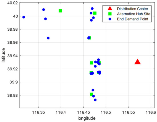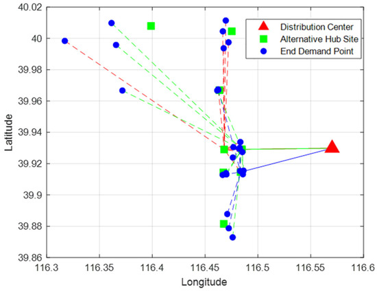 A collection of urban distribution centers, alternative hub sites, and end demand points are designated as , and , respectively. A collection of all nodes is ,. The relevant symbols and variables of the spot in the model are listed in Table 1 and Table 2.