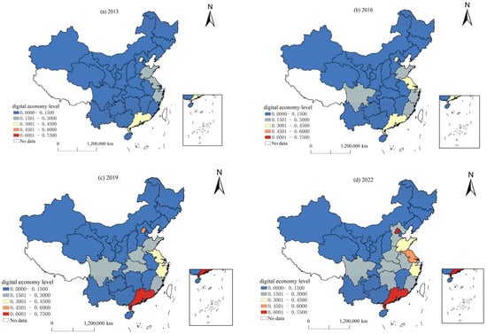 A comprehensive comparison of Figure 1a–d reveals a substantial disparity in China’s digital economy development level, consistent with the findings of previous scholars [], showing a clear east-to-west gradient with a clear advantage in the southeast coastal region, and a strong development momentum in the central region in the later stages of research.