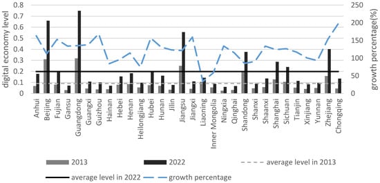 Figure 2 shows the value and growth percentage of the digital economy development level of each province and the national average for 2013 and 2022. The image shows a significant disparity in the level of digital economy development. In 2013, the digital economy levels in Beijing, Guangdong, Jiangsu, Liaoning, Shandong, Shanghai, Sichuan, and Zhejiang surpassed the national average; by 2022, all except Liaoning maintained this status. The analysis reveals that Beijing, Guangdong, Jiangsu, Shandong, Shanghai, Sichuan, and Zhejiang have consistently led the country’s digital economy, while Liaoning has fallen behind due to industrial path dependence and other factors. It experienced a 34.30% increase in the level of digital economy during the research period, the lowest growth rate in the country. Except for Hainan, Hebei, Liaoning, Inner Mongolia, Shandong, Shanxi, and Yunnan, the growth rates of all other provinces exceeded 100%. Due to the growth percentage and the base value, the disparity in digital economy levels among provinces widened by 2022, exemplifying the polarization phenomenon of “the strong get stronger and the weak get weaker”. Similarly, Hou et al. noted significant fluctuations and gaps in China’s digital economy level [], while Yu et al. identified a “four-polarization” pattern centered around Beijing–Tianjin–Hebei, the Pearl River Delta, Chengdu–Chongqing, and the Yangtze River Delta, with provincial capitals leading a pattern of “small agglomeration, large dispersion” [], which aligns with the findings of this study.