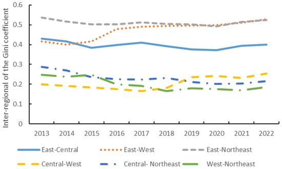 Compared with the conclusions drawn by Luo and Zhou [], who utilized the Gini coefficients at the beginning and end of their study period to determine that intra- and inter-regional disparities had decreased, this paper provides a more intuitive and reliable analysis of disparity changes through line graphs. The narrowing intra-regional disparities observed in the northeast and central regions can be attributed to regional economic integration policies. In contrast, intra-regional disparities within the western region have fluctuated and increased due to policies advocating “the wealthy first driving the less wealthy”, whereas disparities within the eastern region have shown a slight increase. Inter-regional disparities indicate that the digital economy level in the eastern region remains significantly higher than in other regions, and widening gaps between regions may further exacerbate the digital divide.