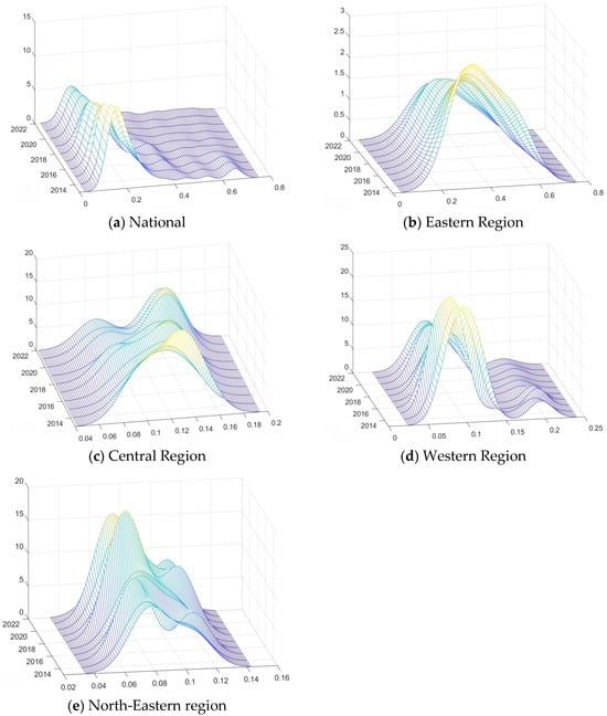 The core of kernel density analysis is converting spatial data points into continuous density surfaces through a sliding window (i.e., kernel function). Continuous density curves are a powerful tool to examine a spatial disequilibrium and to identify the dynamic evolution features of the digital economy growth level []. The horizontal position of the kernel density curve in a specific year represents the digital economy level, while the height of the curve’s peak reflects the extent of integration within that interval, with a higher peak indicating a greater data density. The number of peaks on the curve indicates the level of polarization in the sample data. The curve’s distribution ductility, or the degree of trailing, shows the largest disparity in digital economy levels across different provinces within the region. The longer the trailing, the greater the disparity within the region. Three-dimensional kernel density maps allow for a vertical comparison of the kernel density curves from different years to track the dynamic evolution of the digital economy development level and a horizontal comparison to discern variations in digital economy levels.