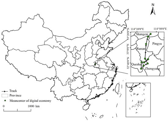 - Calculate the coordinates of the center of gravity, which are determined by Equation (23) []:where (, ) are the latitude and longitude coordinates of the center of gravity of province i, is the digital economy development level of province i, n is the number of provinces, and (, ) are the latitude and longitude coordinates of the center of gravity of the digital economy.