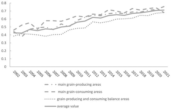 Overall, China’s agricultural sustainable development ability improved steadily from 2002 to 2021 (Figure 1), with an average annual growth rate of 2.47%. The highest ASDI was recorded in 2021 (0.712), followed by 2020 (0.707), and the lowest appeared in 2003 (0.423). Regionally, the highest sustainability levels were found in the main grain-consuming areas, followed by grain-producing areas, with the grain production and consumption balance area exhibiting the lowest levels. From 2002 to 2021, the ASDI in all regions displayed a consistent upward trend. Notably, the grain production and consumption balance area consistently remains below the national ASDI average throughout the study period. This discrepancy is primarily attributed to significant regional heterogeneity in economic, social, and environmental systems, contributing to uneven rural agricultural sustainable development across regions. China’s main grain-consuming areas, such as Beijing and Tianjin, are economically developed and have adopted a large-scale breeding mode, relying on leading enterprises to foster agricultural industrialization. By leveraging advanced production factors and adhering to green, low-carbon development principles, these regions have achieved sustainable modern agricultural development. Shanghai and Zhejiang benefit from favorable agricultural resources and a higher level of agricultural development, enabling them to generate relatively greater economic returns. By contrast, although Fujian and Hainan possess abundant hydrothermal resources, they face severe soil erosion issues, which hinders their agricultural sustainable development compared to other main grain-consuming areas. Meanwhile, the main grain-producing areas, despite their fertile land resources, face ecological pressure due to intensive farming practices. The excessive use of pesticides and chemical fertilizers, coupled with the ongoing push toward mechanization, may explain their lower ASDI values. In addition, the grain production and consumption balance areas are constrained by less favorable water resources and geographic conditions. These areas often suffer from inefficient water usage, high agricultural production costs, and excessive resource consumption, all of which contribute to their lower sustainability levels.