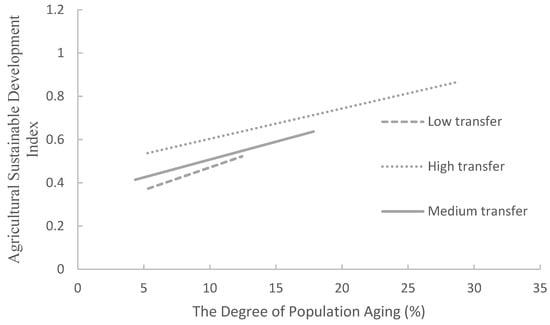 To gain a clearer understanding of how rural population aging interacts with rural labor transfer to influence agricultural sustainable development, a cross-analysis was conducted (Figure 2). As shown in the figure, rising levels of aging do not inhibit agricultural sustainable development. Instead, it positively promotes agricultural sustainable development. Moreover, the higher the proportion of rural labor transfer, the stronger the impact of aging on agricultural sustainable development. This pattern likely emerges because, as more rural residents migrate out, the remaining rural labor force becomes increasingly scarce., Migrants often transfer their land, leading to the expansion of the large-scale farming operations that enhance agricultural sustainable development. Additionally, rural labor transfer contributes to population aging in rural areas, which in turn drives mechanization to improve agricultural production efficiency, thereby further promoting agricultural sustainable development.