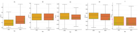Regarding X2, the average company size increased from 2022 to 2023. The standard deviation remained relatively consistent between these years, whereas the minimum and maximum figures for both years also showed an increase. This indicates that the growth of corporate assets was evenly distributed across countries and industry sectors during 2022 and 2023. For X3, average profitability decreased from 7% to 3%. However, the standard deviation decreased by 2023 compared with 2022, and the minimum and maximum values exhibited high volatility. Specifically, the minimum value in 2023 was higher than that in 2022, whereas the maximum value in 2023 was lower than that in 2022. This volatility is attributed to numerous profit spikes, particularly in 2022, primarily due to a surge in other income sources following the recovery from the COVID-19 pandemic [65]. The variable X4 did not exhibit significant changes, as evidenced by the consistent average value between 2022 and 2023. The standard deviation and maximum and minimum values remained unchanged between the years. This suggests that the company’s condition was generally perceived as favorable by investors in 2022 and 2023, resulting in the company’s cost of debt remaining stable.