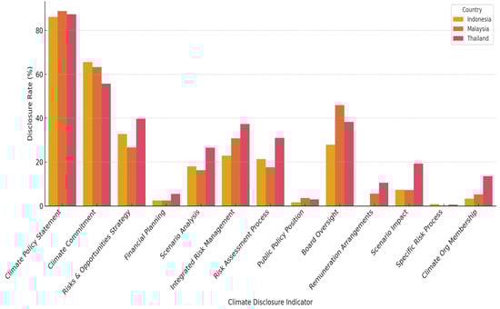 Figure 3 illustrates the cross-country comparison of climate disclosure indicators for Indonesia, Malaysia, and Thailand in 2022 and 2023. The chart reveals that while basic disclosures such as “climate policy statement” and “climate commitment” have relatively high adoption rates, more advanced aspects like “financial planning”, “remuneration arrangements”, and “specific risk process” remain minimally disclosed across all countries. Thailand generally had higher disclosure rates across multiple indicators in 2023, followed by Malaysia and Indonesia. The overall upward trend from 2022 to 2023 suggests incremental progress in climate policy transparency, although disparities remain both across countries and between different dimensions of climate-related governance.