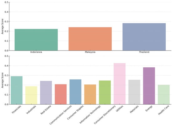To provide a clearer comparison of climate change management progress, Figure 4 presents the average scores of X1 across countries and industry sectors. The top panel of the figure shows that Thailand leads in climate policy management on average, followed by Malaysia and Indonesia, indicating varying levels of national commitment and regulatory influence. Meanwhile, the bottom panel highlights significant disparity across industry sectors, with utilities and energy showing the highest average scores, suggesting greater pressure or need for climate policy integration in high-impact sectors. Conversely, sectors such as industrials and health care showed relatively lower averages, pointing to potential gaps in climate governance practices. Together, these visualizations reinforce the heterogeneity of climate management performance and underscore the need for both country-level and industry-specific strategies to enhance climate disclosure and accountability.