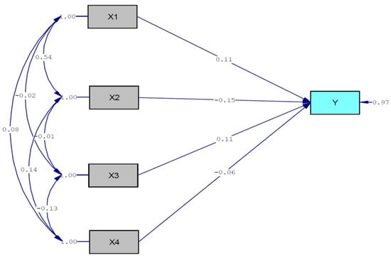 The results of the path analysis are presented in Table 6. The probability values for all variables were below the threshold of α = 5%, indicating that all independent variables exerted an influence on the dependent variable. The adjusted R2 value was 3%, and the F-test results also indicated that the model was suitable for further analysis. For the X1 variable, the path coefficient was positive, and the probability value was below 5%, thereby supporting the acceptance of the research hypothesis. This finding is also visually represented in Figure 5, which shows the direction and strength of each path coefficient from X1 to X4 toward Y, further illustrating the relative influence of each independent variable on firm value.