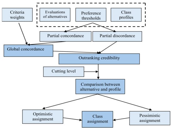Both procedures can be applied in parallel, especially in sensitivity analyses, data uncertainty assessments, or multi-stage classification [78]. The use of concordance and discordance tests allows for the inclusion of both positive and negative preference information, making ELECTRE Tri a flexible tool that is robust to data imprecision and the subjectivity of the decision maker’s evaluations. The entire decision-making process—from the selection of input data, through the calculation of concordance and discordance indices, to the assignment of objects to classes—is illustrated in Figure 1 [75].