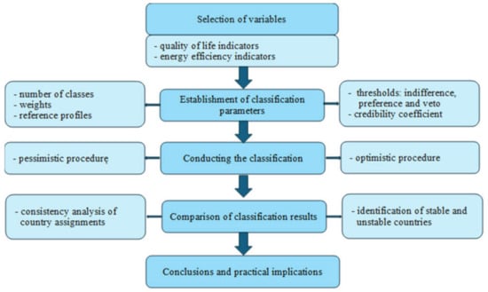 Today’s challenges of energy transition and SD require the use of advanced methods, enabling a comprehensive assessment of the efficiency of energy systems and the impact of energy policies on society and the economy. One of the approaches used in such studies is the ELECTRE Tri method, which belongs to the ELECTRE family of techniques (Elimination et Choix Traduisant la Réalité) and utilizes the outranking relation. It makes it possible to classify objects into predefined categories, taking into account both measurable indicators and subjective preferences of decision-makers [38]. Its wide application is due to its ability to process multidimensional data and take into account complex decision-making processes.