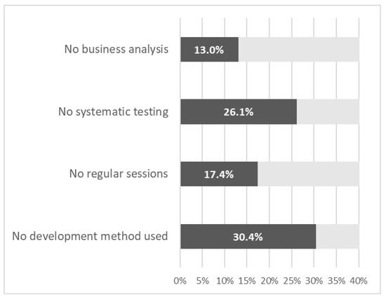 - Limited adoption of development methods: Regarding the use of development methods (Figure 1), over 30% (95% CI [13.56%, 50.21%]) of respondents report that no specific method is employed in their organization. A survey by Vukelja et al. [28] (p. 559) on computer development practices across all sectors revealed that 18.8% of respondents did not use any software development method. Although this comparison suggests that the industrial sector is still lagging behind, it should be interpreted with caution due to the margin of uncertainty surrounding the current estimate.In addition, over a quarter of participants (26.1%, 95% CI [10.23%, 45.49%]) reported not conducting systematic testing of their developments. Furthermore, 17% (95% CI [4.14%, 35.48%]) said they do not organize regular project review meetings, and 13% (95% CI [0.15%, 30.12%]) indicated that no business analysis is carried out prior to development. These findings highlight the relatively limited integration and adoption of standard development practices. However, the small sample size leads to wide confidence intervals, which calls for a cautious interpretation of these results.