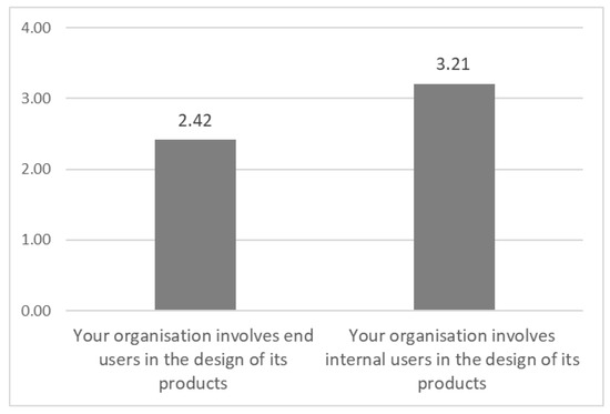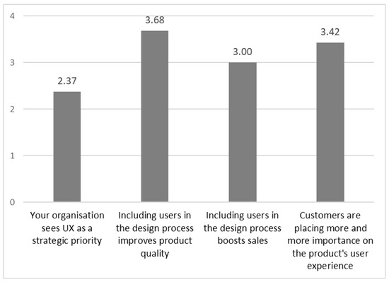 - The benefits of UX are recognized: Although the data above seems to indicate a mixed perception of UX as a strategic issue by management, it is important to highlight the benefits attributed to UX practices by respondents (Figure 5). On a 4-point Likert scale (1 = “strongly disagree” and 4 = “strongly agree”), they rate the statement “Integrating users in the design process improves the quality of products” an average of 3.68 (95% CI [3.48, 3.89]). Regarding the statement “Integrating users in the design process helps boost sales”, they assign an average score of 3.00 (95% CI [2.71, 3.26]). Furthermore, they consider that customer requirements in terms of user experience are becoming increasingly important, scoring an average of 3.42 (95% CI [3.09, 3.75]).