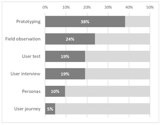 - Organizational literacy: On a 4-point Likert scale (1 = “strongly disagree” and 4 = “strongly agree”), the statement “Your organization involves end-users in the design of its products” (Figure 3) scored an average of 2.42 (95% CI [2.12, 2.72]); 30% of respondents (95% CI [13%, 50%]) gave this statement a score of 3 or 4. When the question concerns the involvement of internal users, the average score increases to 3.21 (95% CI [2.90, 3.51]). At first glance, these figures indicate a relatively satisfactory consideration of users in the design process. However, data on the UX methods employed within respondent organizations contradict this perception (Figure 4). The proportion of organizations using methods that truly identify and integrate user needs, such as user testing, observations, or interviews, remains very minor. Interviews reveal that internal users are mainly technicians and trainers who visit clients and thus serve as key liaisons between R&D and end-users, facilitating information feedback.“We have technicians who go on-site, but also salespeople. And then, through formal and informal discussions, information comes back up (…) it creates descriptions of new features that users request.”(P2)There is indeed regular contact with users through technicians and trainers. Nevertheless, the information fed back is primarily concerned with integrating new features or bug fixes. However, it does not allow an accurate understanding of the operator’s activity as structured and tailored methods would. Although there is a willingness, none of the surveyed companies has implemented a process to truly formalize and capitalize on this field feedback.