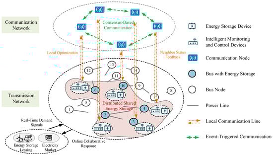 Shared energy storage has received increasing attention in both academia and industry due to its potential to improve energy flexibility, resource utilization, and cost-effectiveness in multi-user scenarios [3,4,5]. Based on the organization of storage resources, shared energy storage systems can be categorized into Centralized Shared Energy Storage (CSES) and Distributed Shared Energy Storage (DSES) [6]. CSES is typically deployed at specific locations in the form of large-scale storage stations, providing services to multiple users [7]. This model benefits from economies of scale and centralized management but also presents challenges such as high construction costs, spatial constraints, a limited flexibility, a strong dependence on the grid infrastructure, and a vulnerability to single-point failures. In contrast, DSES consists of multiple geographically dispersed storage units that coordinate efficiently through intelligent optimization strategies to achieve effective resource sharing [8]. This structure offers a greater flexibility and scalability but also introduces a higher control complexity due to the distributed architecture.