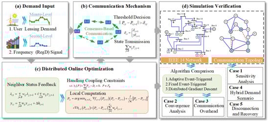 For a DSES system with multiple distributed storage units, optimization scheduling methods can be broadly categorized into centralized optimization scheduling and distributed optimization scheduling [9,10]. Centralized optimization scheduling relies on a central controller to collect global information and perform a unified optimization. Theoretically, this centralized approach provides an optimal coordination solution from a system-wide perspective [11]. However, due to the high computational complexity, extensive communication requirements, and the risk of single-point failures, its application in large-scale DSES is limited [12]. In particular, it struggles to coordinate a large number of storage units in real time, making it difficult to respond quickly to time-sensitive tasks such as frequency regulation [13]. Distributed coordination methods reduce reliance on a central coordinator by employing decentralized optimization strategies, where the optimization process primarily relies on local information exchange among storage units [14]. Each storage unit performs simplified independent computations based on local information rather than solving the full global optimization problem. Through iterative information sharing with neighboring units, the system gradually converges toward a globally optimal solution, effectively reducing computational complexity and improving optimization efficiency. Additionally, this method supports the dynamic integration and withdrawal of storage units, offering strong plug-and-play adaptability. Newly added storage units do not require a reconstruction of the global optimization model; instead, they can compute their local optimization variables and gradually integrate into the system through information exchange with neighboring units. This feature enhances the flexibility and scalability of DSES.