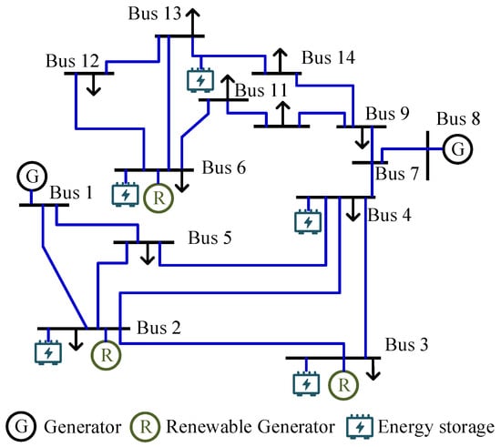 The IEEE 14-bus system is selected as the test platform, widely used for power system optimization and stability analysis. It consists of 5 generator buses, 11 transmission lines, and 11 load buses, with integrated renewable energy sources and energy storage units to simulate an intelligent grid environment (as shown in Figure 3). Detailed node numbering and equipment parameters are provided in Table 1.