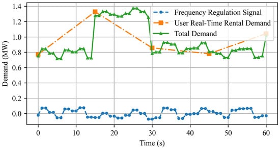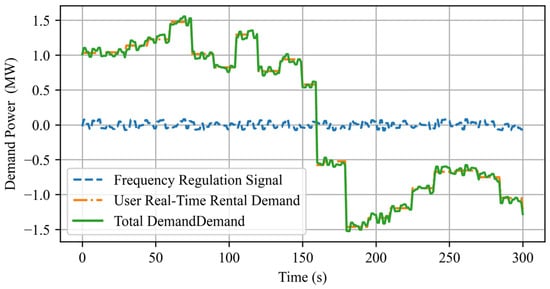 In the real-time scheduling of a distributed shared energy storage (DSES) cluster, optimizing power allocation to meet both frequency regulation needs and fluctuating user leasing demands is crucial. Figure 6 presents the input data, including frequency regulation commands, user leasing demand, and the total demand variations over time. Frequency regulation commands fluctuate rapidly with small amplitudes, reflecting real-time grid balancing needs, while user leasing demand changes less frequently, remaining stable over longer periods. This results in multi-level system demand variations, combining short-term fluctuations from frequency regulation with longer-term stability from user leasing requirements.