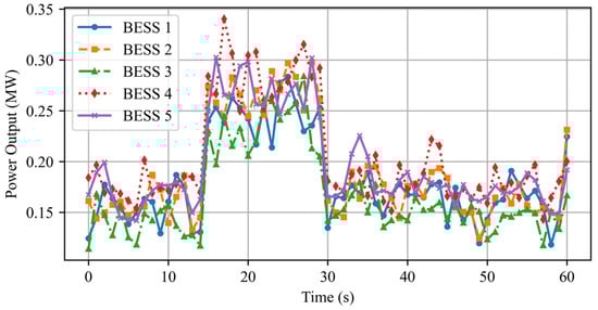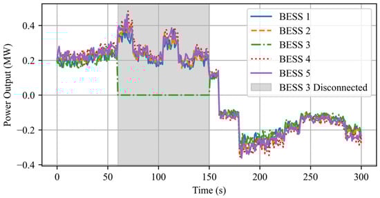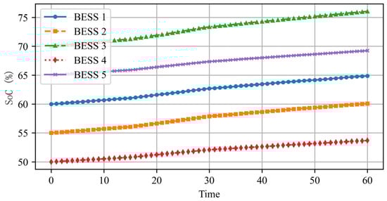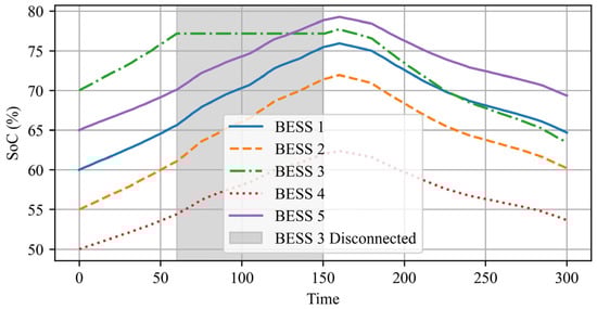 Figure 11 illustrates the power scheduling trajectory under storage unit disconnection and reconnection. When storage unit 3 disconnects, the system quickly adjusts, with other units increasing their output to compensate. Power trajectories remain stable, ensuring a balanced load distribution. Upon reconnection, unit 3 gradually restores output, and the system returns to pre-disconnection levels smoothly. These results confirm that the algorithm enables a rapid adaptation to unit outages and a stable reintegration, preventing scheduling instability. Figure 12 illustrates the SoC variations.
