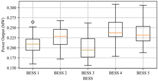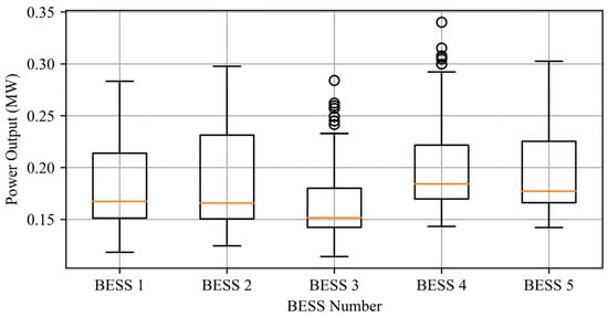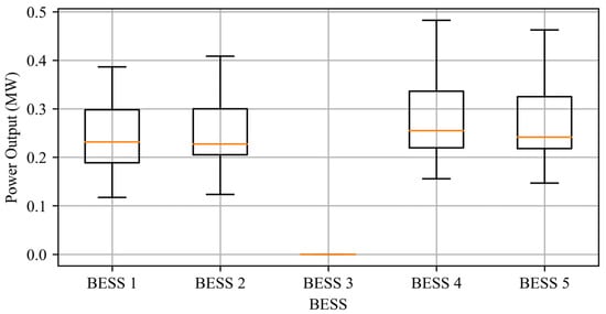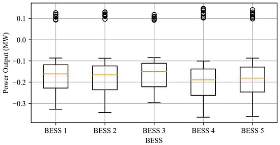 In distributed optimization, maintaining a balanced power allocation is as crucial as flexibility. Overloading a few storage units can shorten their lifespan, increase charge–discharge cycles, and accelerate battery degradation. Figure 8 presents the distribution of power scheduling among storage units using a box plot. The results show the uniform power distribution, with no single unit consistently handling excessive load. The box lengths and interquartile ranges indicate that power fluctuations remain within a controlled range, without extreme values, ensuring system-wide balance. The distribution of outliers suggests that while some units experience short-term high loads, these occurrences are sporadic and not persistent. Additionally, the median power outputs of storage units are closely aligned, demonstrating that the proposed optimization algorithm effectively maintains load balance, preventing premature aging due to prolonged high loads. Compared to traditional methods, which may overburden specific storage units, the proposed consensus-based optimization enables dynamic load-sharing across all units. During high-demand fluctuations, storage units coordinate power adjustments locally, avoiding the excessive charging or discharging of individual units. This balanced scheduling not only reduces equipment wear but also enhances system stability under sudden load variations, ensuring long-term efficient operation.