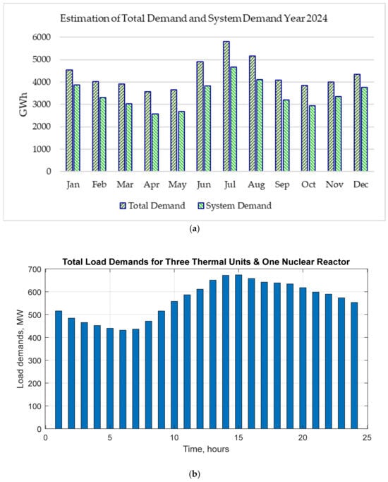(a) Total demand and system demand per month in year 2024 in Greece [66]; (b) Electric total load demands in July 2024 at the studied area [65].