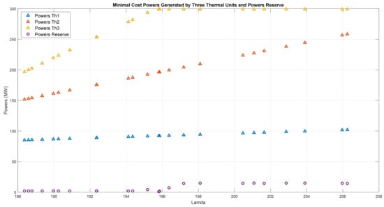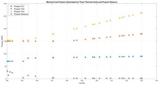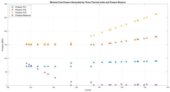 The objective function is the total operating cost rate of the generators [19,46]. The cost rate per hour is considered, where is power-generated by thermal unit . The sum of the generated is equal to the electrical load , and the power balance constraint is expressed in Equation (2) by the function which is