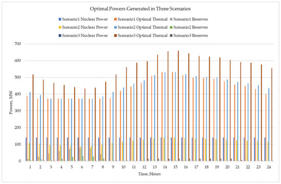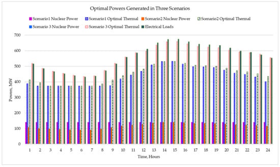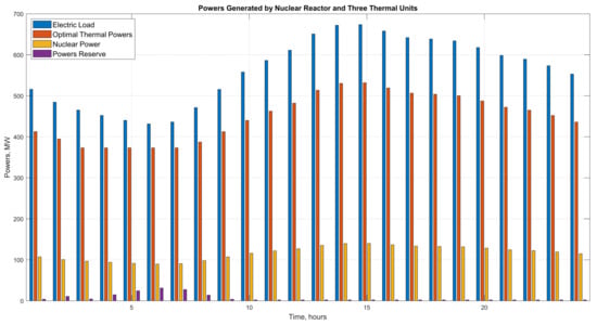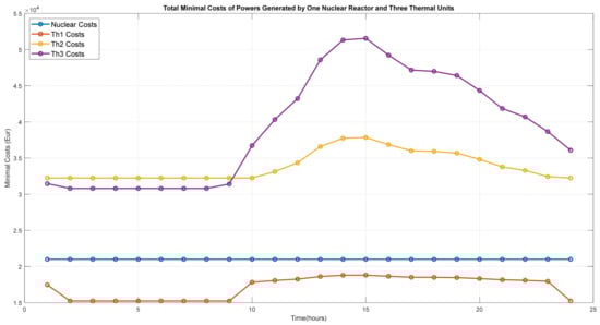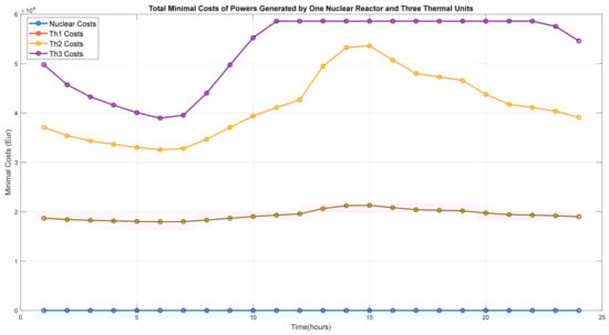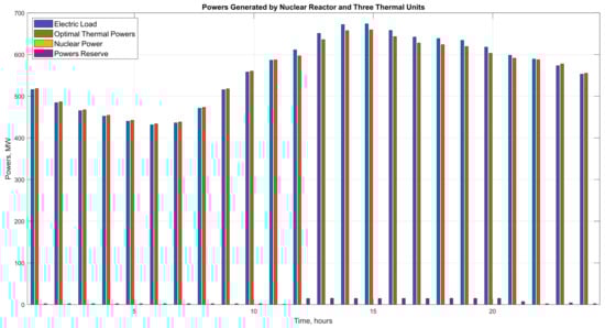 In this paper, the description of a hybrid nuclear–thermal system is in Section 2. The methodology of modeling economic optimization and solving the system using multicriteria decisions is presented in Section 3. Using specific scenarios, the control of the power generated by a nuclear reactor and thermal units operating in a constant output mode or in a load-following mode up to a target load level within a 24 h timeframe is presented in Section 4. Section 5 of this paper discusses the results. Finally, conclusions are made in Section 6, alongside with future research directions. Additionally, the technical data of the system are in Appendix A and nomenclature is in the abbreviation section.