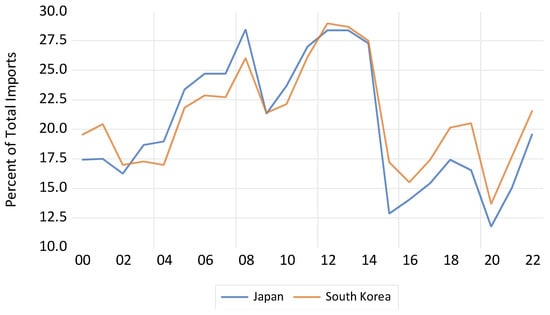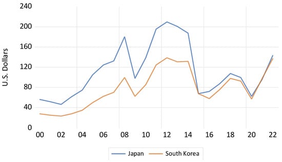 Both countries also wrestle with energy security. For Japan, 99.6% of the crude oil supply came from imports in 2023, and for Korea, 98.9% came from imports. Figure 1 shows the percentage of petroleum products in Japan and Korea’s total imports. On average, over the 2000 to 2022 period, 20% of Japan’s imports and 21% of Korea’s imports were petroleum products. Petroleum is by far the leading import category for both countries. Figure 2 shows the U.S. dollar (USD) value of petroleum imports. On average, over the 2000 to 2022 period, Japan imported USD 113 billion per year and Korea imported USD 77 billion per year.